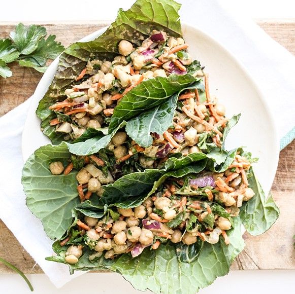 3. На каждый лист капусты Кале выложите часть начинки и полейте сверху соусом тахини. Также можно добавить сверху немного соуса шрирача (сирача).