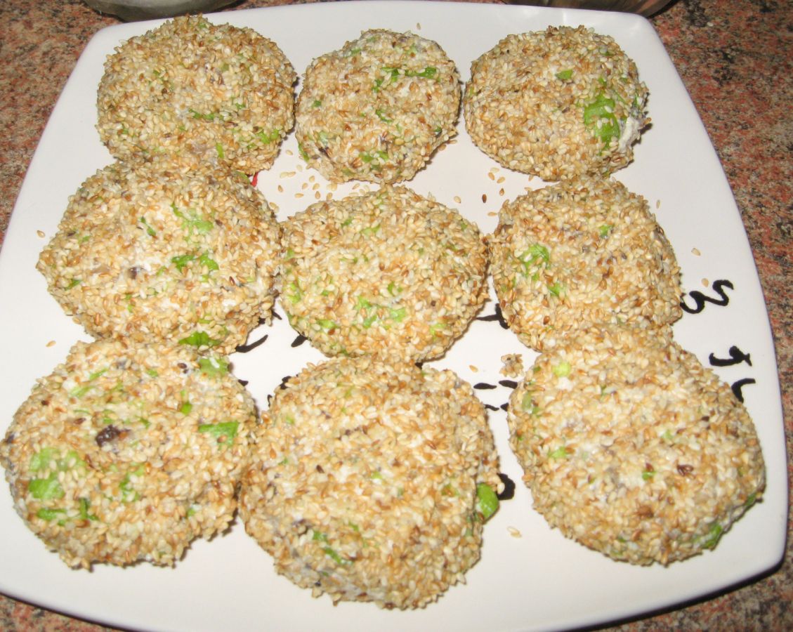 Добавляем к этому всему 1 столовую ложку любого имеющегося масла. Котлетки для клейкости обволакиваем в перемолотых семенах льна и кунжута. В качестве гарнира подавался соус из авокадо, зелени и огурца, а также сельдереевой солью, который хоть и выглядит не очень аппетитно, зато на вкус просто божественен.