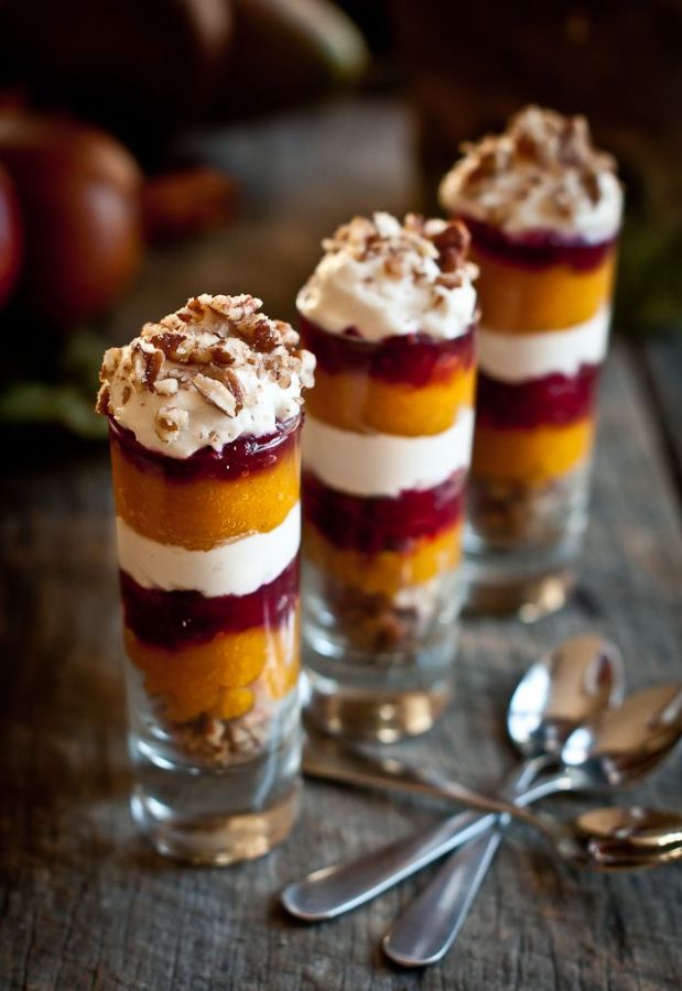 Лучше всего подобрать красивые узкие высокие стаканчики, в которые вы ложка за ложкой(маленькой) будете выкладывать каждый слой. На самое дно положим орешки, сверху будет тыквенный слой, затем клюквенный, и потом уже имбирный. Верхушечку можно украсить кусочками тыковки, ягодками клюквы, мяткой или же орешками с кокосовой стружкой.